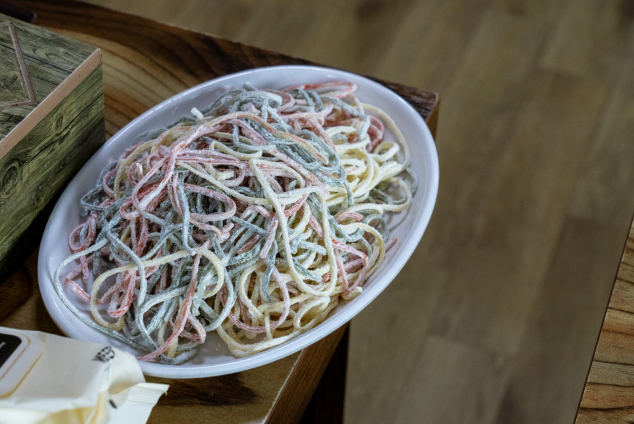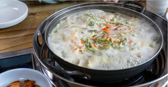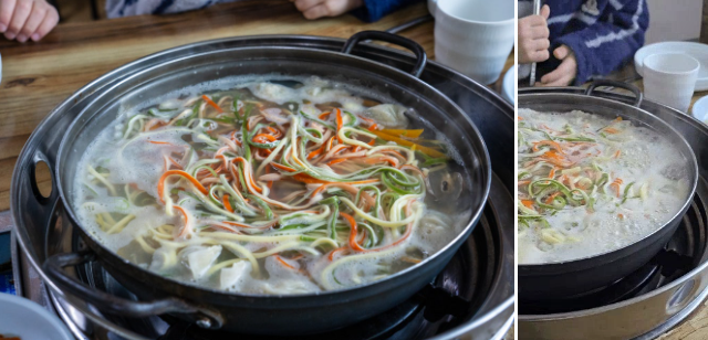바지락과 물만두가 듬뿍 들어간 시원한 칼국수 육수 냄비가 나오면 3색 면을 넣고 팔팔 끓여드시면 되시겠습니다.