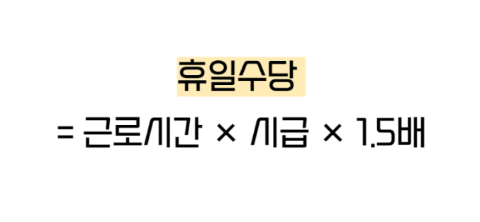 휴일수당 = 근로시간 X 시급 X 1.5배로 계산되어 지급됩니다.