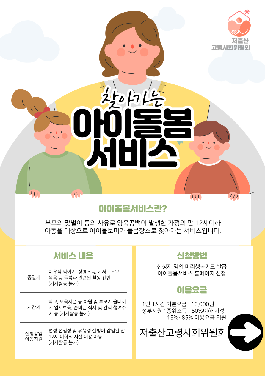 아이돌봄서비스는 만 12세 이하 아동을 둔 맞벌이 가정 등에 아이돌보미가 직접 방문하여 아동을 안전하게 돌봐주는 서비스이며, 시간제 돌봄과 종일제 돌봄으로 구분됩니다.