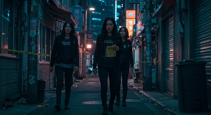 현대적인 도시 배경에서 활약하는 여성 탐정단의 모습