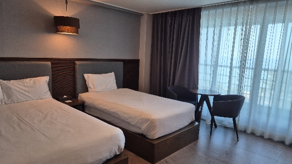 호텔에 도착하자마자 느껴진 건 깔끔하고 모던한 분위기였어요. 로비부터 세련된 인테리어가 눈길을 사로잡더라고요. 디럭스트윈 객실은 생각보다 넓었는데, 두 개의 싱글베드가 여유롭게 배치되어 있었답니다.