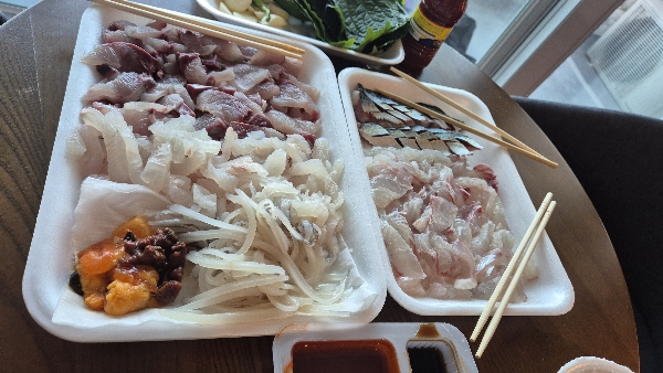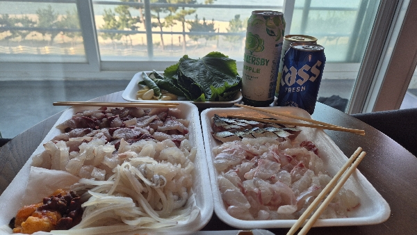 양양 여행의 백미는 역시 해산물이죠! 주문진에서 회를 사고 회를 떠서 가기로 했고, 모둠회가 정말 신선하고 맛있었어요. 특히 밀복도 철이라고 해서 같이 서비스로 받아서 회를 떴습니다.