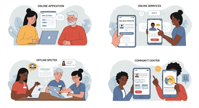 온라인 및 오프라인으로 지원금을 신청하는 과정 묘사