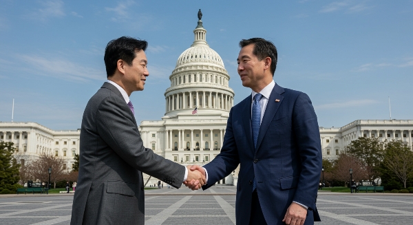 워싱턴 D.C.에서 미국 공무원과 악수하는 한국 비즈니스맨