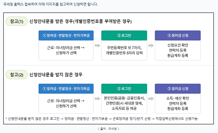 1. 정기 및 반기 신청이 있으며, ①근로소득만 있는 경우에는 반기, 정기 중 선택하여 신청할 수 있으며,