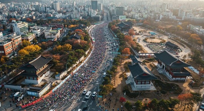 서울의 주요 명소를 지나는 마라톤 코스를 공중에서 바라본 장면