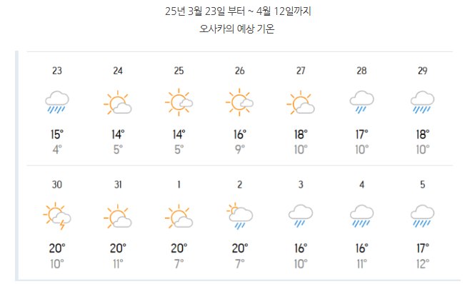 일본은 대체로 벚꽃이 피는 3월 말~ 4월 초의 오사카 평균 기온은 최고 기온 19도, 최저 기온 10도 정도인데,