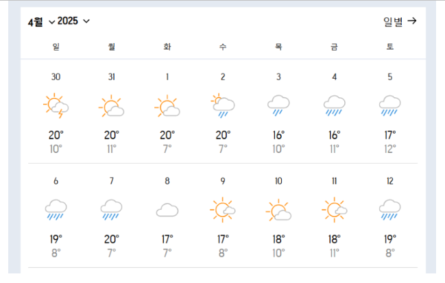 날짜 | 3월 20일 | 3월 24일 | 3월 25일 | 3월 22일 | 4월 23일 |