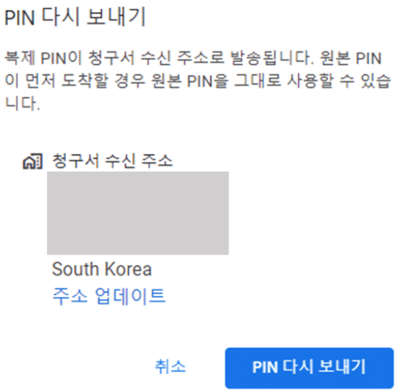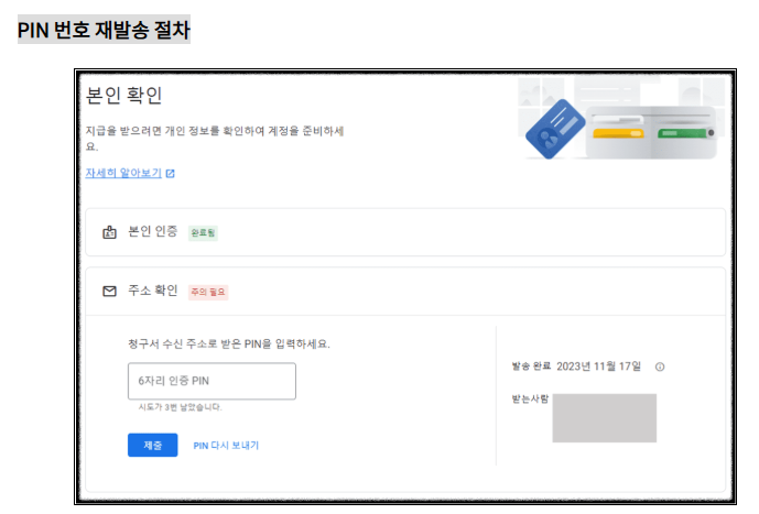 구글 애드센스 사이트에 접속하여 로그인 후 '지급 →본인 확인'을 클릭하고, 받는 사람의 주소가 맞게 적혀 있는지 확인후 'pin 다시 보내기'를 클릭합니다.