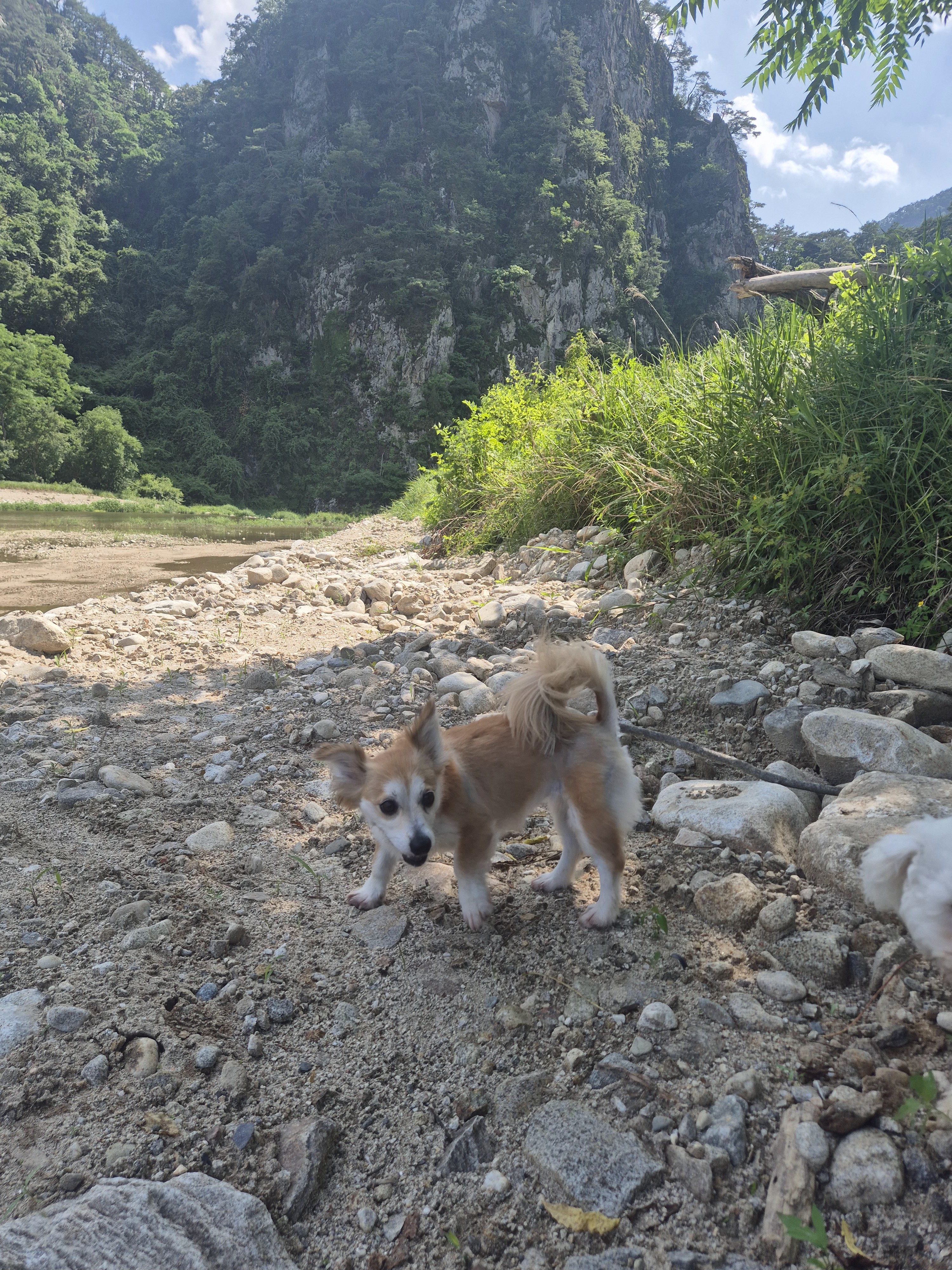 원주 칠봉계곡은 아이들 물놀이에 정말 안성맞춤이에요. 수심이 얕고 물살이 잔잔해서 어린 아이들도 안전하게 놀 수 있었죠. 우리 e댕댕이들은 처음에 물이 차갑고 무서운지 안들어가려고 하더니, 금세 적응하고 신나게 첨벙첨벙!