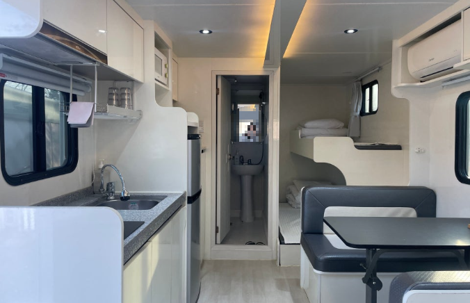 부엌과 화장실 2층 침대가 있습니다. 오른편에는 2층 침대에 넓은 침대가 있습니다.