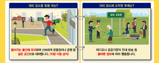 건물과는 떨어져 있어야 한다. 집결 장소에 오지 못한 사람이 생겼을 경우 해야 할 일을 정한다. 대피소(시에서 지정)가 있는 경우에는 가족들 모두 집, 학교, 직장에서 가장 가까운 대피소를 알아둔다.