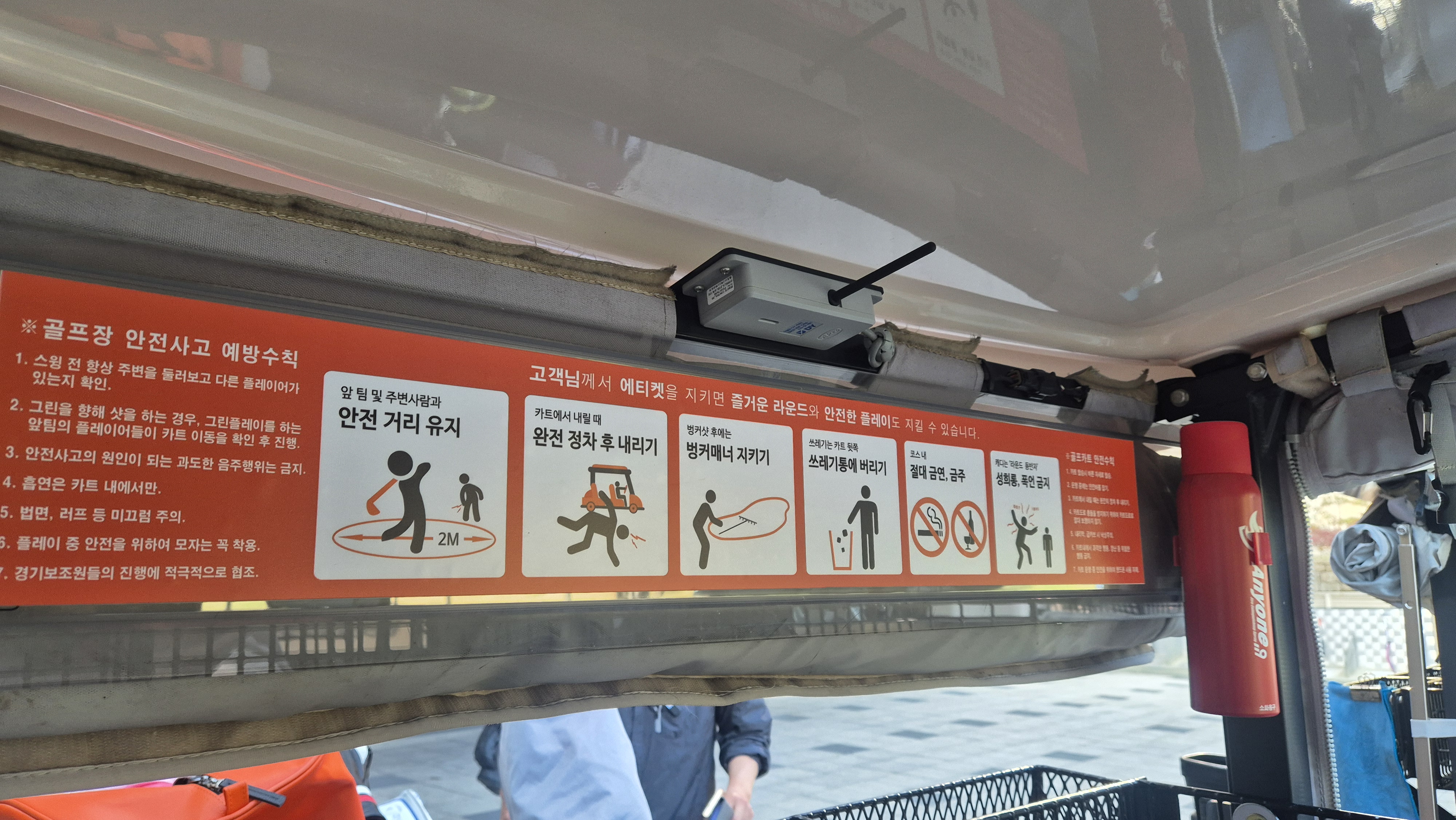 처음 도착해서 인상이 너무 깊었던 건 카트에 소화기가 비치되어 있던것과 안전사고 예방수칙이 이렇게 보기쉽게 또 설명이 되어있고, 카트에 안전바 설치가 앞,뒤로 되어있는것이 너무 인상적이었습니다.
