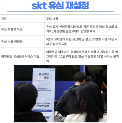 안녕하세요. 정보를 알려드리고 싶은 연이입니다! 최근 SK텔레콤을 비롯한 알뜰폰 가입자 다수의 유심(USIM) 정보 유출 가능성이 제기되면서 사회적으로 상당한 파장이 일었던 것으로 기억합니다. 이로 인해 많은 가입자들이 불안감을 느끼며 유심 교체를 위해 매장을 방문했으나, 유심 재고 부족 사태가 발생하며 혼란이 가중되기도 했습니다. 이러한 상황에 대응하기 위해 sk텔레콤은 2025년 5월 12일부터 유심을 물리적으로 교체하지 않고도 보안을 강화할 수 있는 '유심 재설정' 기존 명칭 skt 유심 포맷 서비스 를 전국 T월드 매장을 통해 시작한다고 발표했습니다.